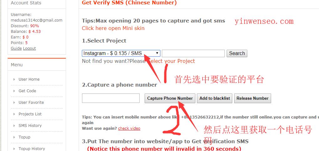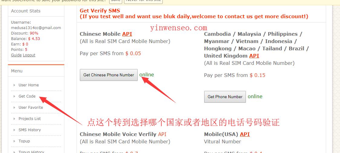 接下来我们需要选择使用哪个国家的电话号码:这里推荐使用中国的电话号码,便宜哈,直接点Get Chinese Phone Number