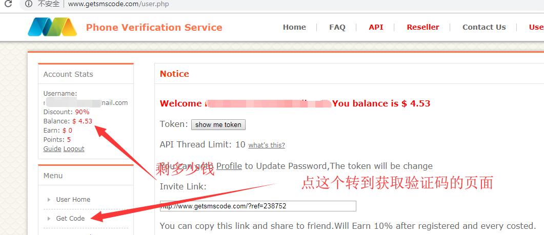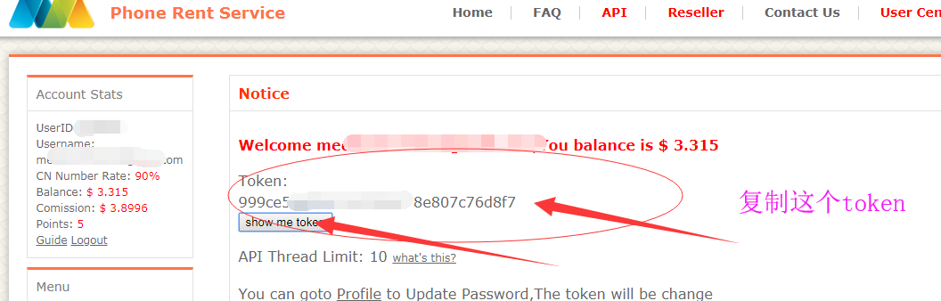 首先我们要在getsms网站上获取登录的token,登录后的第一个界面上获取,如下图