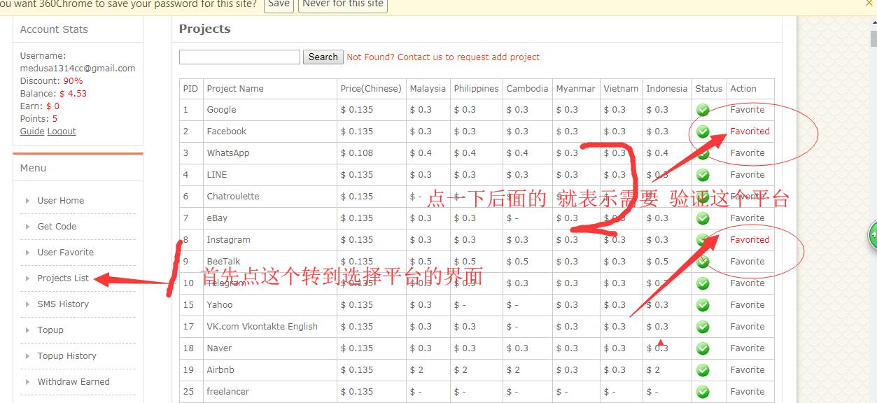 使用前,我们需要在网站上先登录设置设置我们要验证哪些平台的验证码(ps:如果你要验证的账号使用了私人代理IP,最好电脑上有两个浏览器,一个登录getsmscode网站,一个使用chrome代理登录你你要验证的账号),操作如下图所示: