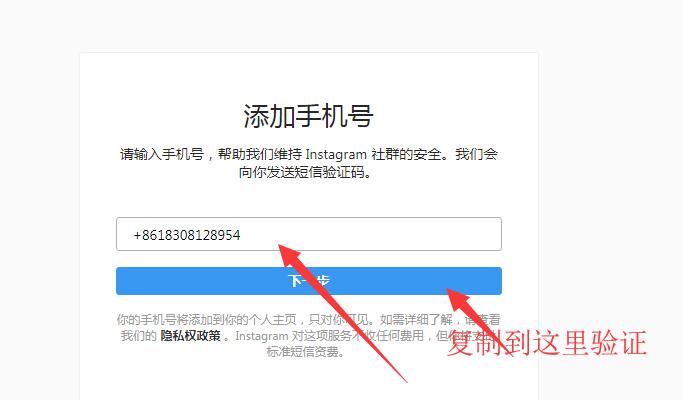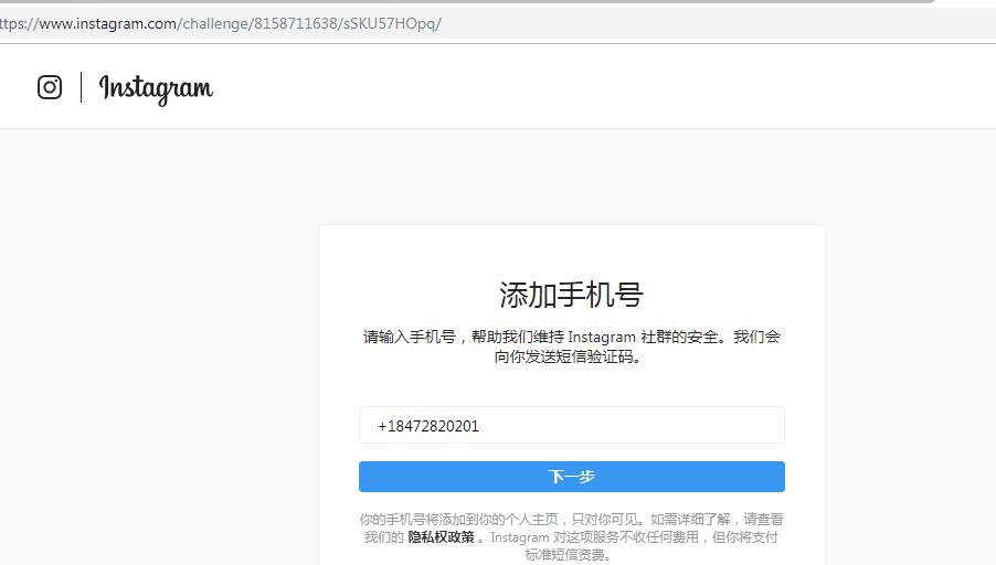 然后把网站上获取到的手机号码,复制到instagram验证网页上面,然后点下一步: