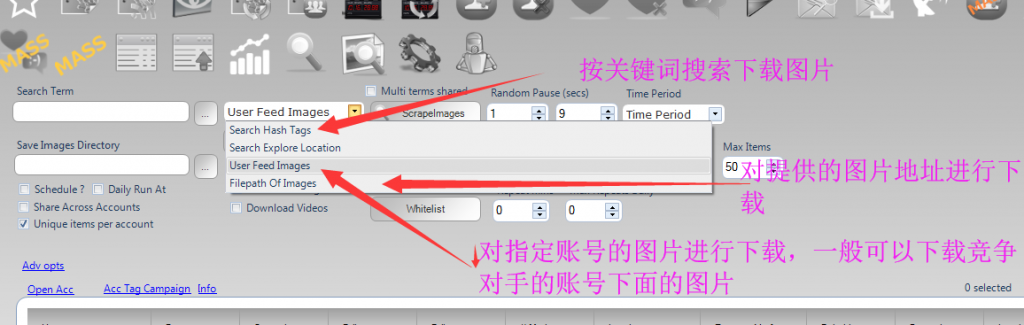 然后软件提供了多种找寻下载图片的功能,比如关键词搜索下载 比如对竞争对手的账号图片进行下载 或者对指定地址的图片进行下载的功能: