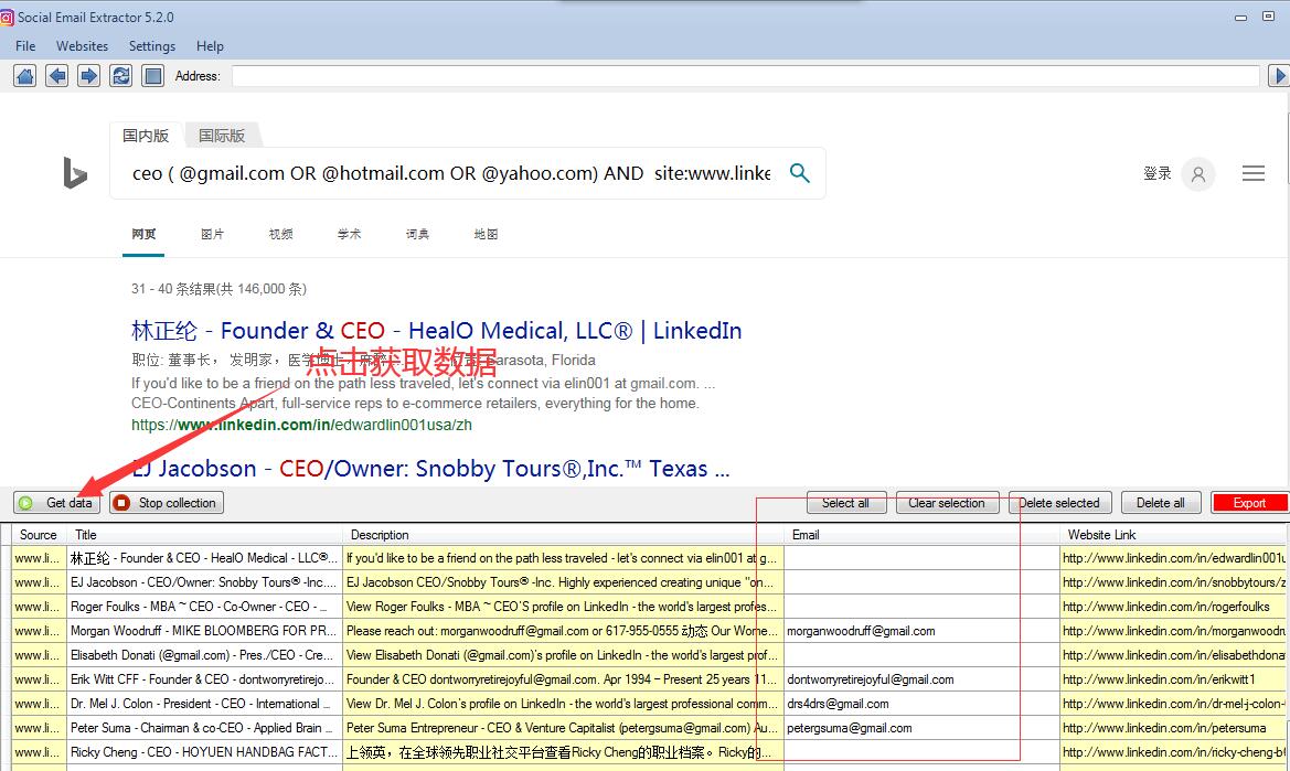 该程序将自动提取具有相关职位名称和电子邮件地址的linkedin成员的信息(如果该信息已由用户发布)。电子邮件地址的成功率非常高,它们都是真实的电子邮件,例如@ gmail.com,@ yahoo.com和@ hotmail.com。