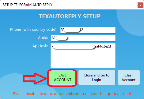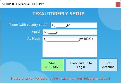 在TexAutoReply 的设置屏幕中,在相关字段中输入电话号码(带国家代码)、api_id 和 api_hash。最后点击保存。